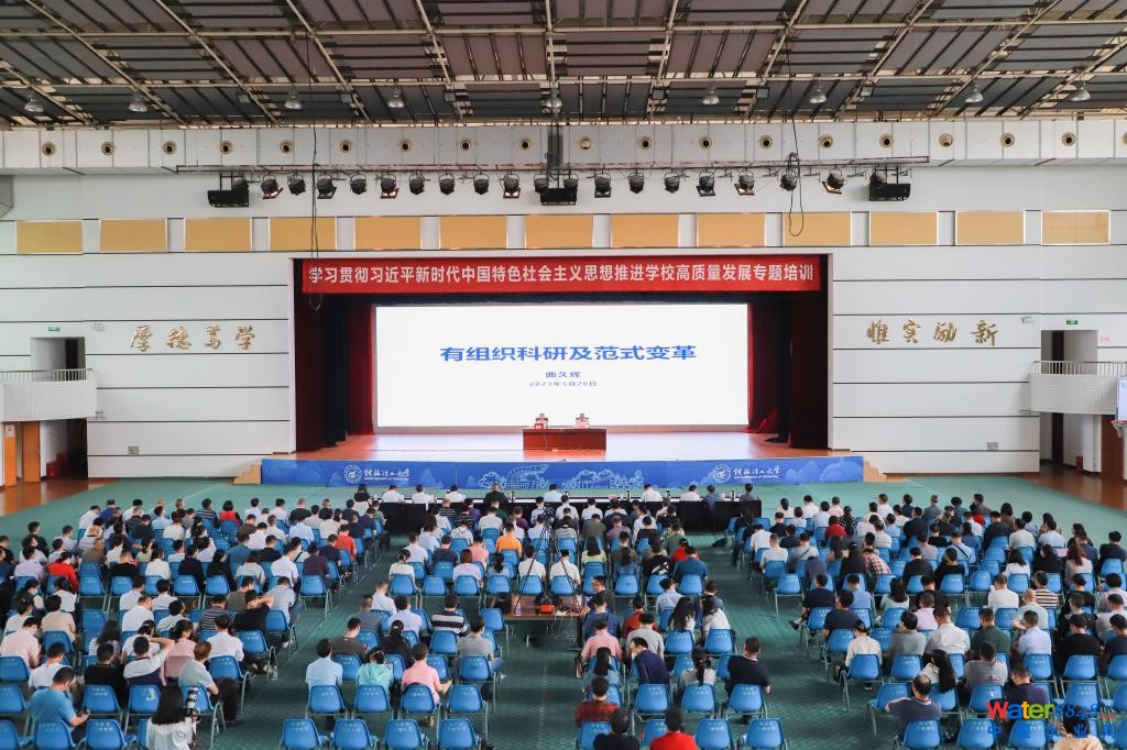 為深入學(xué)習(xí)貫徹習(xí)近平新時(shí)代中國(guó)特色社會(huì)主義思想和黨的二十大精神,切實(shí)推動(dòng)學(xué)校加快發(fā)展高質(zhì)量發(fā)展,5月26日上午,學(xué)校在屏風(fēng)校區(qū)體育館三樓舉辦“學(xué)習(xí)貫徹習(xí)近平新時(shí)代中國(guó)特色社會(huì)主義思想 推進(jìn)學(xué)校高質(zhì)量發(fā)展”專(zhuān)題培訓(xùn)。我校名譽(yù)校長(zhǎng)、中國(guó)工程院院士、發(fā)展中國(guó)家科學(xué)院院士、美國(guó)國(guó)家工程院外籍院士曲久輝受邀到場(chǎng)作專(zhuān)題報(bào)告。在家校領(lǐng)導(dǎo)鄧軍、王敦球、吳志強(qiáng)、周?chē)?guó)清、韋學(xué)敏、曾繁榮,黨委常委唐壯東、葉昊、邱杰,黨委委員、校長(zhǎng)助理辛立章等出席報(bào)告會(huì)。會(huì)議由學(xué)校校長(zhǎng)王敦球主持。學(xué)校處級(jí)、科級(jí)干部,教研室及實(shí)驗(yàn)室主任、副主任到場(chǎng)聆聽(tīng)。