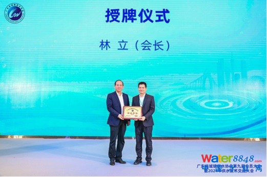 廣東省城鎮(zhèn)供水協(xié)會會長林立為協(xié)會第九屆秘書長董玉蓮頒發(fā)聘書