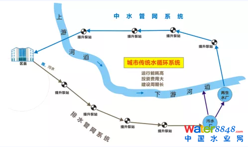 雖然很多污水處理廠有了美麗的外衣,但城市內(nèi)河缺少生態(tài)補水的問題依然存在。隨著群眾對生活環(huán)境要求的提高,河長制的不斷深化推進,內(nèi)河缺水問題凸顯,建立中水管網(wǎng)系統(tǒng)成為城市河道補水的重要工程。傳統(tǒng)方法是在集中污水處理廠出水端建立再生水廠并通過補水管道進行河道補水,但由于大部分集中污水處理廠位于城市中心下游30km的距離,遠距離輸送能耗高,而且回用管道鋪設(shè)成本高,在推行過程中難度很大(見圖1)。