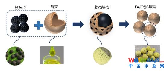 在鐵硫自養(yǎng)反硝化工藝中硫自養(yǎng)反硝化過程產(chǎn)生H+,而鐵自養(yǎng)反硝化過程能消耗產(chǎn)生的H+,不僅確保出水的pH保持穩(wěn)定,且無需額外添加pH緩沖劑。同時由于生物自養(yǎng)作用無需額外添加碳源,達(dá)到深度脫氮目的同時又可以降低處理成本。但在硫自養(yǎng)反硝化過程中會產(chǎn)生較多SO42-。采用新型核殼結(jié)構(gòu)與鐵碳微電解技術(shù)結(jié)合的方式,利用鐵碳微電解技術(shù)還原廢水中的SO42-,進(jìn)一步提升脫氮效率。