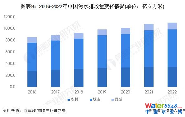 據(jù)住建部公布數(shù)據(jù)顯示,2016-2022 年,我國污水排放總量持續(xù)提升,2022 年,污水排放量達(dá)到 1099 億立方米,同比增長 1.7%,其中,城市、農(nóng)村、縣城污水排放量分別為 639 億立方米、345.3 億立方米、114.9 億立方米。