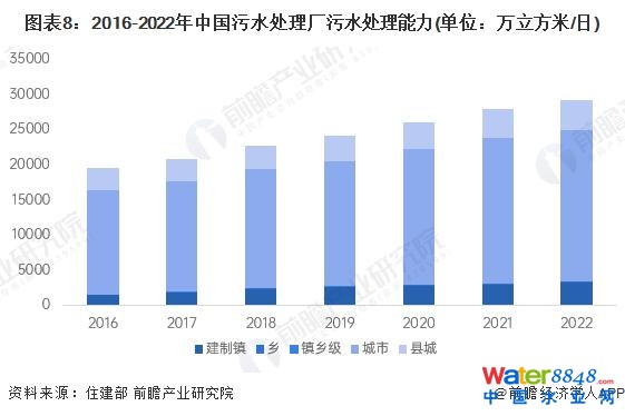 隨著國家政策不斷推動污水處理提質(zhì)增效,我國污水處理廠處理能力大幅提高,其中,在鄉(xiāng)村振興戰(zhàn)略支持下,農(nóng)村為增速最快的區(qū)域,據(jù)住建部統(tǒng)計數(shù)據(jù),2016-2022 年,建制鎮(zhèn)、鄉(xiāng)區(qū)域污水處理能力年復(fù)合增長率分別為 14.1%、33.3%,遠(yuǎn)高于城市、縣城區(qū)域。