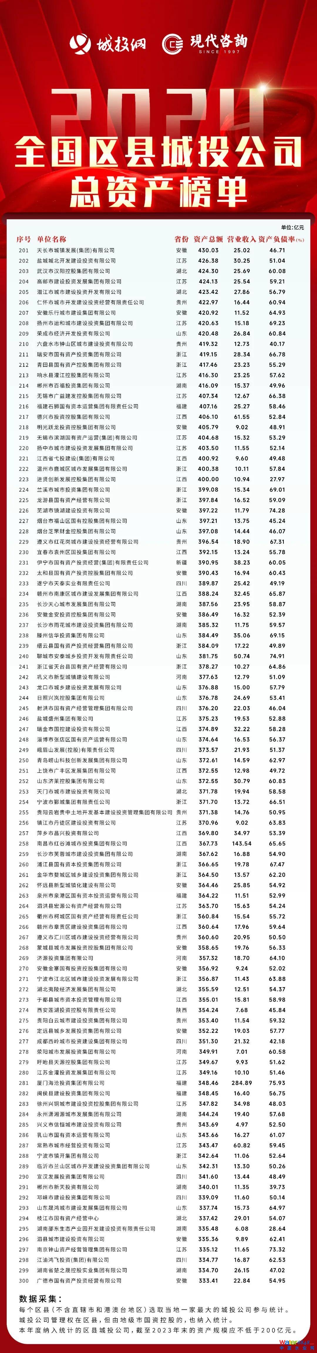 2024全國(guó)區(qū)縣城投公司總資產(chǎn)榜單(201-300)