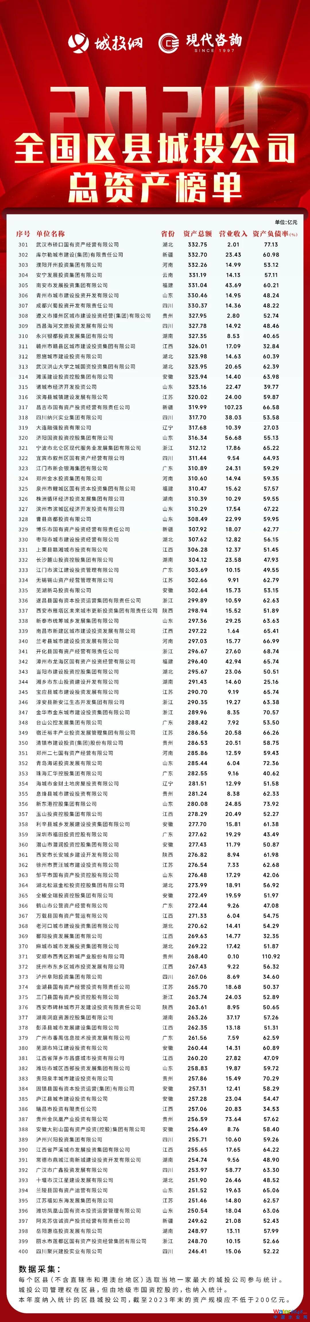 2024全國(guó)區(qū)縣城投公司總資產(chǎn)榜單(301-400)