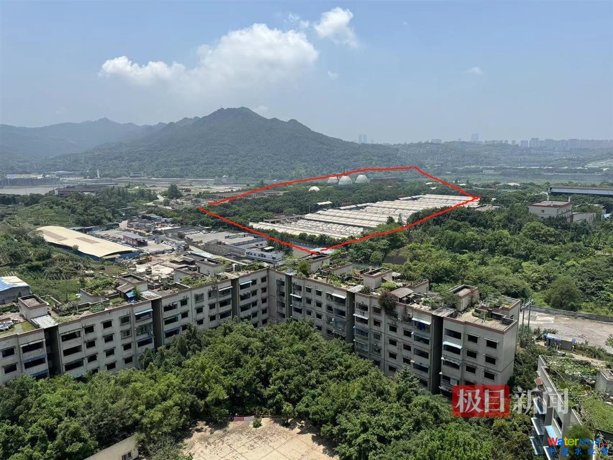 6月12日,極目新聞記者實地走訪金色花苑小區(qū)二期,二期由4棟居民樓聯(lián)建組成,其中11棟離唐家沱污水處理廠最近。從11棟頂樓向江邊望去,可看見加了蓋的污水處理廠設(shè)施,社區(qū)工作人員稱,污水處理廠與金色花苑11棟之間的距離為280多米。