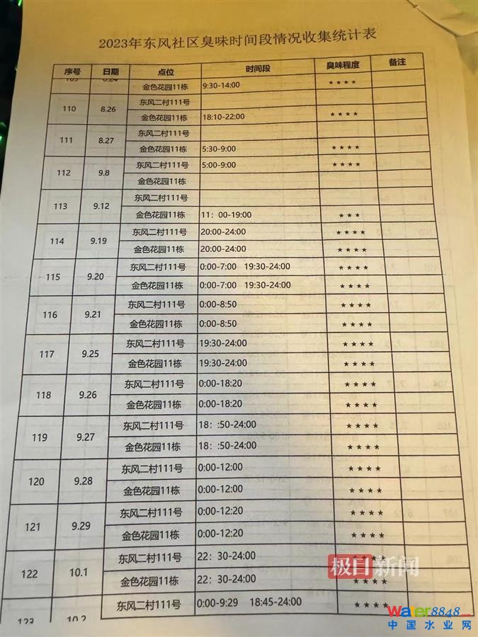 金色花苑小區(qū)和東風(fēng)二村111號的居民們用表格記錄了臭味的時間,極目新聞記者翻閱看到,記錄臭味的時間段大多是在夜間。