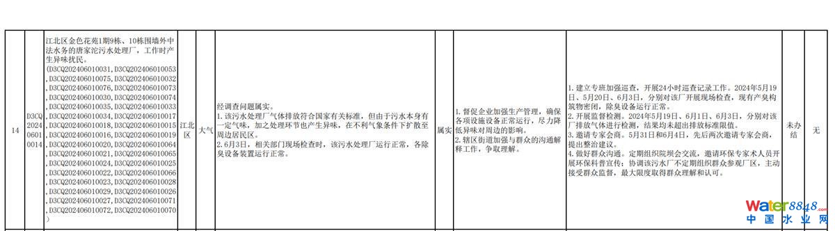 極目新聞記者注意到,6月12日,重慶市生態(tài)環(huán)境局公布了《中央生態(tài)環(huán)境保護(hù)督察群眾信訪舉報轉(zhuǎn)辦和邊督邊改公開情況一覽表》,該表格顯示,經(jīng)調(diào)查群眾所反映問題屬實,唐家沱污水處理廠氣體排放符合國家有關(guān)標(biāo)準(zhǔn),但由于污水本身有一定氣味,加之處理環(huán)節(jié)也產(chǎn)生異味,在不利氣象條件下擴(kuò)散至周邊居民區(qū)。