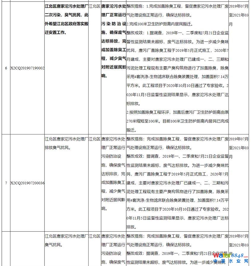 2021年3月30日,重慶江北區(qū)政府官網(wǎng)公布的《第二輪環(huán)保督察群眾舉報投訴問題整改銷號第二批情況公示》顯示,針對群眾投訴的唐家沱污水處理廠臭氣擾民情況,整改成效為:唐污廠加蓋除臭工程于2019年5月正式施工,2020年7月建成,主要對唐家沱污水處理廠已建成一、二、三期和污泥處理工程現(xiàn)有主要產(chǎn)臭構(gòu)筑物進(jìn)行了加蓋除臭,除臭采用4套洗滌—生物濾床聯(lián)合除臭裝置處理,加蓋面積7.14萬平方米。此工程項目于2020年10月10日通過了專家驗收。2020年11月5日監(jiān)督性監(jiān)測結(jié)果顯示,唐家沱污水處理廠達(dá)到了排放標(biāo)準(zhǔn)。按照加蓋除臭工程環(huán)評,加蓋后唐污廠衛(wèi)生防護(hù)距離由原270米縮短至100米,目前100米衛(wèi)生防護(hù)距離內(nèi)居民已完成搬遷。
