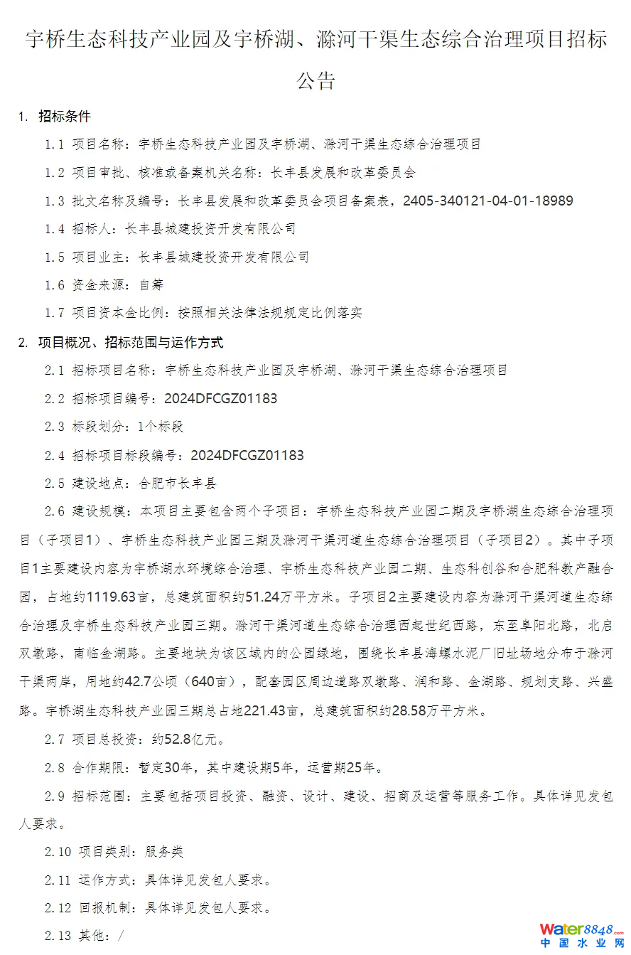 北極星環(huán)保網(wǎng)獲悉,6月5日,安徽宇橋生態(tài)科技產(chǎn)業(yè)園及宇橋湖、滁河干渠生態(tài)綜合治理項目公開招標(biāo),總投資52.8億元,招標(biāo)人長豐縣城建投資開發(fā)有限公司。