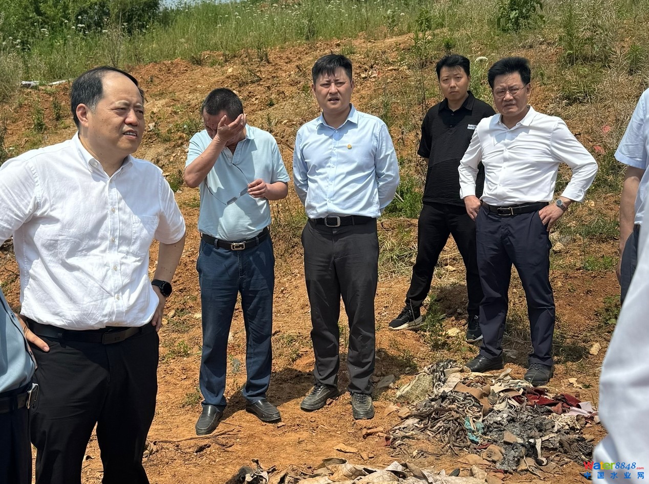 5月16日,湖北武漢黃陂區(qū),閆景軍(左一)在三店村現(xiàn)場查看非法垃圾填埋場違規(guī)堆存建筑垃圾情況 澎湃新聞記者 刁凡超 圖