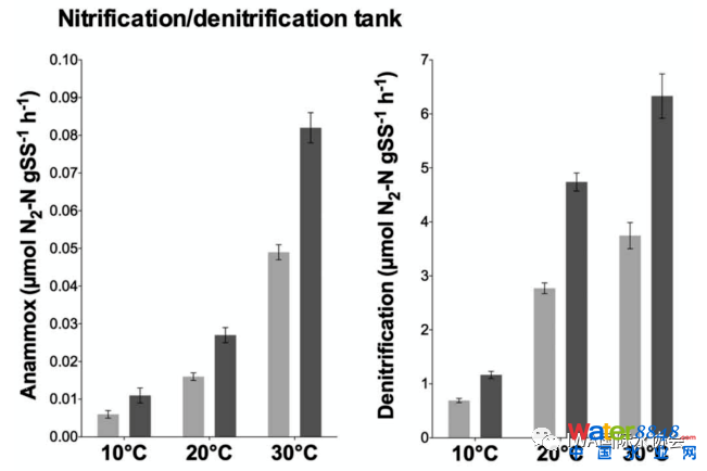 如下圖1所示,厭氧氨氧化和反硝化反應(yīng)顯示了溫度依賴性,在30°C時(shí)反應(yīng)速率最高,而且溫度對(duì)anammox菌影響更明顯—— 10°C的速率和30°C的速率相差近10倍