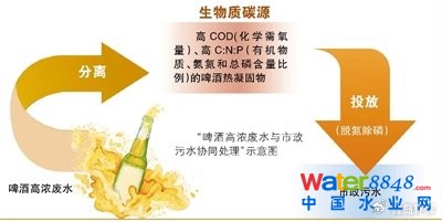 啤酒生產(chǎn)廢水中有機物濃度很高,可生化性極好,且不含有毒有害物質(zhì),可以作為城市污水處理廠碳源的絕佳補充,但由于需要執(zhí)行污水間接排放標準,必須投入大量資金經(jīng)過預處理后再排入污水管網(wǎng),屬于一種典型的“放錯位置的資源”。另一方面,下游污水處理廠卻因為碳源不足而外購乙酸鈉用于污水處理中的反硝化脫氮除磷反應,運行費用大大增加。面對這個資源浪費的矛盾,如何才能“變廢為寶”?在青島市生態(tài)環(huán)境局的積極協(xié)調(diào)努力下,首先解決了啤酒行業(yè)水污染物排放標準的政策障礙,青島水務集團與青啤公司組建技術(shù)攻堅團隊,經(jīng)反復實驗,成功從啤酒生產(chǎn)廢水中分離出適合作為碳源的熱凝固物,通過在污水處理廠精準投放試驗,實現(xiàn)技術(shù)革新突破。