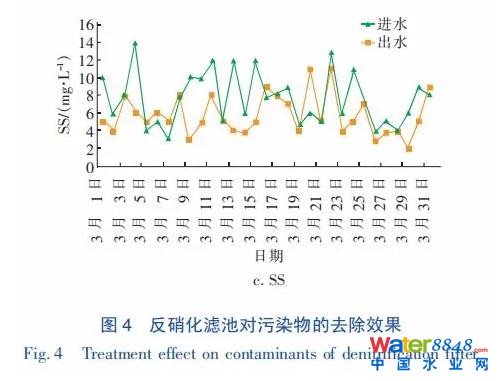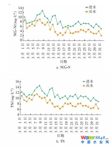 經(jīng)連續(xù)運(yùn)行,系統(tǒng)整體、各子系統(tǒng)和設(shè)備運(yùn)行正常,穩(wěn)定可靠。主要監(jiān)測項目有進(jìn)、出水的 COD、SS、 TP、TN、NH3 - N、NO-3 - N、NO-2 - N 等,出水水質(zhì)穩(wěn)定達(dá)到且優(yōu)于一級 A 標(biāo)準(zhǔn)。2018 年 3 月主要水質(zhì)指標(biāo)變化如圖 4 所示。
