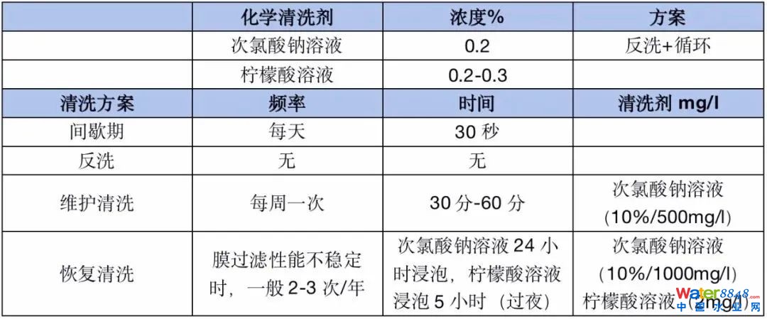 眾所周知,MBR供應(yīng)商都有自己的強(qiáng)力清洗配方,主要區(qū)別是清洗劑濃度和清洗方法。以MBR供應(yīng)商Z公司為例:
