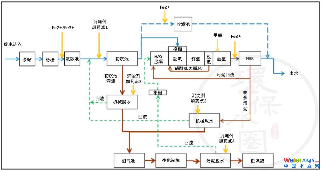5)處理工藝。宜采用脫氮效果好、運(yùn)行能耗低的改良型兩級(jí)AO-MBR 工藝,生化系統(tǒng)及膜池一級(jí)回流。