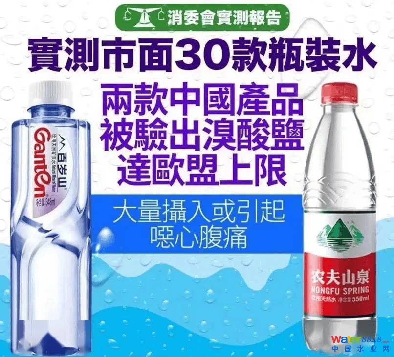 按照香港消委會的最初說法,他們在消毒劑殘余及副產(chǎn)品測試中,發(fā)現(xiàn)了百歲山及農(nóng)夫山泉的溴酸鹽含量正好達到了歐盟上限(0.003mg/L)。