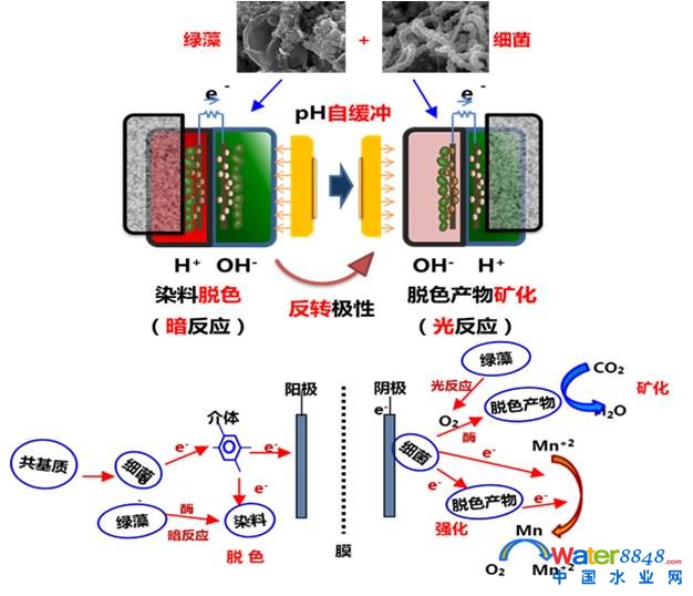 [2]構(gòu)建新型連續(xù)反轉(zhuǎn)極性運(yùn)行的藻菌生物電化學(xué)系統(tǒng),實(shí)現(xiàn)陰、陽(yáng)極pH動(dòng)態(tài)自緩沖、單電極礦化偶氮染料和同步產(chǎn)電。解決了生物電化學(xué)法降解偶氮染料和產(chǎn)電過(guò)程中偶氮染料及其降解產(chǎn)物對(duì)產(chǎn)電菌活性的抑制、偶氮染料脫色液礦化率不高、陰極負(fù)載金屬催化劑、需曝氣和使用緩沖液導(dǎo)致的二次污染和成本問(wèn)題。實(shí)際應(yīng)用中,以易降解有機(jī)廢水為共基質(zhì),可實(shí)現(xiàn)易降解有機(jī)廢水和偶氮染料廢水同時(shí)處理,以廢治廢,并同步產(chǎn)電。
