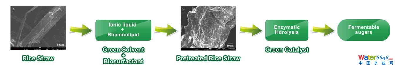 圖3 以離子液體耦合表面活性劑預(yù)處理生物質(zhì)廢棄物增加產(chǎn)糖效率流程