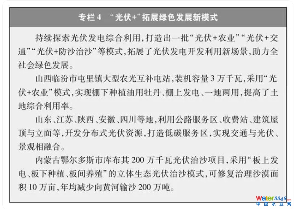 推動(dòng)風(fēng)電、光伏發(fā)電躍升發(fā)展。中國(guó)風(fēng)能、太陽(yáng)能資源豐富,風(fēng)電、光伏發(fā)電成為清潔能源的主力軍。有序推進(jìn)大型風(fēng)電光伏基地建設(shè),以庫(kù)布其、烏蘭布和、騰格里、巴丹吉林沙漠為重點(diǎn),規(guī)劃建設(shè)4.5億千瓦大型風(fēng)電光伏基地項(xiàng)目。推進(jìn)海上風(fēng)電規(guī);夯l(fā)展,累計(jì)裝機(jī)規(guī)模達(dá)3728萬(wàn)千瓦。積極推進(jìn)分布式新能源發(fā)展,開展“千鄉(xiāng)萬(wàn)村馭風(fēng)行動(dòng)”“千家萬(wàn)戶沐光行動(dòng)”,推廣農(nóng)光互補(bǔ)、漁光互補(bǔ)、牧光互補(bǔ)等“光伏+農(nóng)業(yè)”新模式,打開了農(nóng)村新能源發(fā)展的廣闊空間。截至2023年底,中國(guó)風(fēng)電、光伏發(fā)電累計(jì)裝機(jī)容量分別達(dá)4.41億千瓦、6.09億千瓦,合計(jì)較10年前增長(zhǎng)了10倍。其中,分布式光伏發(fā)電累計(jì)裝機(jī)容量超過(guò)2.5億千瓦,占光伏發(fā)電總裝機(jī)容量40%以上。