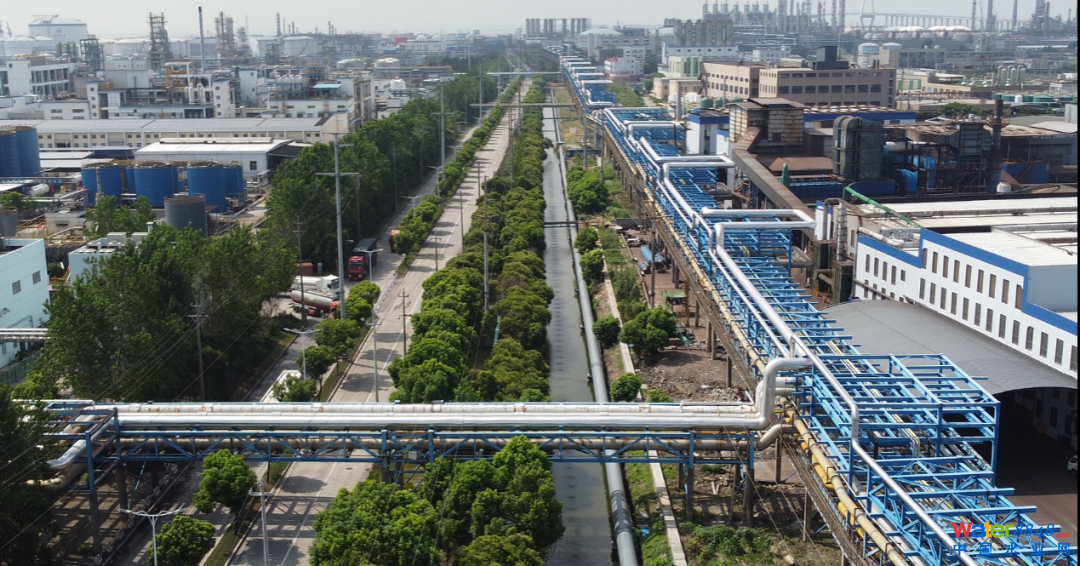 走進園區(qū),可以發(fā)現(xiàn),園區(qū)配套建設(shè)了許多架空管廊。通過這些明管,企業(yè)可以直接將高濃的廢水輸送至嘉興港區(qū)工業(yè)污水集中處理廠的高濃污水處置線,所產(chǎn)沼氣通過收集管道進入沼氣發(fā)電系統(tǒng),產(chǎn)生電量基本覆蓋污水處理廠二期運營所需電力,間接實現(xiàn)每日碳減排17.4噸。而企業(yè)的清下水,則會通過專管收集至園區(qū)污水處理廠低濃廢水處理線處理后排放,后期實施的清下水分質(zhì)處理工程,將中水回用至上游企業(yè),實現(xiàn)水資源的循環(huán)利用。