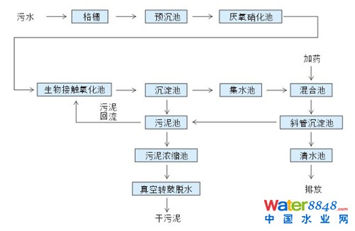 此流程采用生化與物化處理串聯(lián),提高了處理效果。加藥后采用斜板沉淀,縮短沉淀時(shí)間。