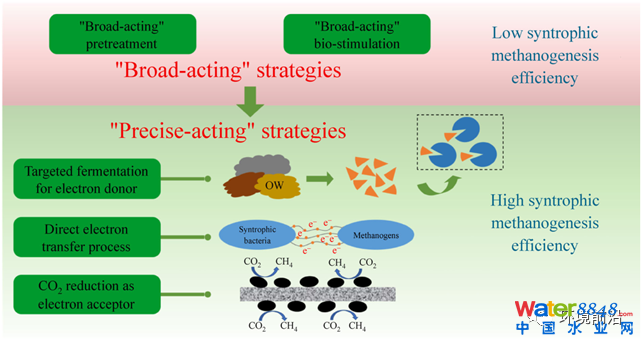 為解決該問題,傳統(tǒng)的研究重點(diǎn)聚焦于對(duì)有機(jī)廢物性質(zhì)的優(yōu)化和生物刺激。一方面,采用多種預(yù)處理方法來增強(qiáng)復(fù)雜有機(jī)廢物的增溶和轉(zhuǎn)化。另一方面,通過生物刺激提高關(guān)鍵酶活性和緩解抑制效應(yīng),以增強(qiáng)產(chǎn)甲烷菌的代謝能力。然而,傳統(tǒng)的預(yù)處理方法只能在一定程度上增強(qiáng)有機(jī)廢物的增溶和水解,無法精準(zhǔn)地為產(chǎn)甲烷提供合適的底物。常用的生物刺激策略也不能精準(zhǔn)刺激產(chǎn)甲烷菌的代謝。更糟糕的是,預(yù)處理后氨氮等代謝物的濃度會(huì)顯著增加,這將加劇對(duì)產(chǎn)甲烷菌活性的抑制。另外,在某些情況下,預(yù)處理過程中的物理和/或化學(xué)反應(yīng)會(huì)產(chǎn)生新的難降解物質(zhì),這將進(jìn)一步降低有機(jī)物轉(zhuǎn)化率和甲烷產(chǎn)量。因此,預(yù)處理方法和生物刺激這些提升產(chǎn)甲烷效率的“廣泛作用”策略對(duì)整個(gè)厭氧系統(tǒng)都有影響,不能有針對(duì)性地直接促進(jìn)產(chǎn)甲烷過程。為了克服傳統(tǒng)方法的瓶頸,需要進(jìn)一步開發(fā)“精準(zhǔn)作用”策略,即潛在的有針對(duì)性的產(chǎn)甲烷強(qiáng)化方法。
