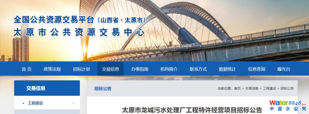 日前,從全國公共資源交易平臺、太原市公共資源交易中心獲悉,太原市龍城污水處理廠工程特許經(jīng)營項(xiàng)目招標(biāo)公告已公示,項(xiàng)目總投資為167157.45萬元(不含征拆費(fèi))。