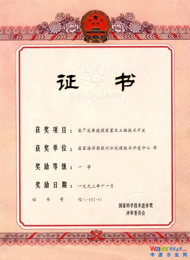 1992年中空纖維反滲透膜及組器的研發(fā)與反滲透膜產(chǎn)業(yè)化應(yīng)用的3個項(xiàng)目:大規(guī)模集成電路超純水系統(tǒng)示范工程、國產(chǎn)反滲透裝置在電廠高壓鍋爐補(bǔ)給水系統(tǒng)的應(yīng)用示范工程、國產(chǎn)反滲透裝置在海島地下苦咸水淡化系統(tǒng)的應(yīng)用示范工程一起,合并為“國產(chǎn)反滲透膜裝置及工程技術(shù)開發(fā)”項(xiàng)目,申報到國家海洋局,獲得了國家海洋局科技進(jìn)步一等獎。又通過國家海洋局申報到國家,國家也給予了肯定,榮獲國家科技進(jìn)步一等獎。那一年一共有37個項(xiàng)目獲得了國家科技進(jìn)步一等獎,考慮到各方面因素,其中的4個項(xiàng)目獲獎內(nèi)容不予公開,本項(xiàng)目便是那4個之一。