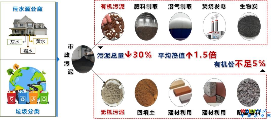 契合污泥低碳處置主流路線,借鑒污水源分離、垃圾分類的處置思路,開展污泥綠色低碳處理處置方式創(chuàng)新研究。將生活污水廠污泥拆分為有機污泥、無機污泥兩部分,探索“污泥源分離”精準(zhǔn)資源化利用與安全處置。與傳統(tǒng)污泥處置相比,通過源分離預(yù)處理,污泥總量減少30%,有機污泥平均熱值提高1.5倍。
