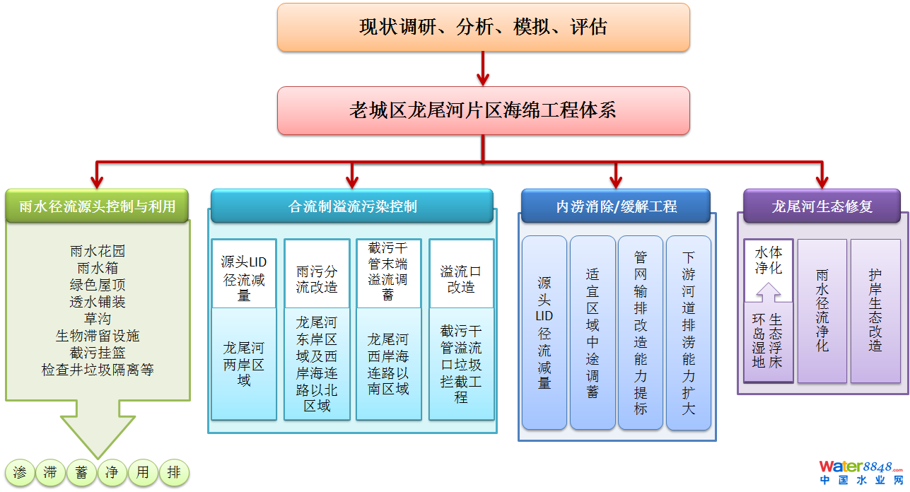 結(jié)合試點(diǎn)區(qū)域的水文、地質(zhì)、水資源、建筑密度、綠地率、土地利用布局、匯水區(qū)特征和LID 設(shè)施的功能、經(jīng)濟(jì)性、適用性、景觀效果等因素,具體提出”滲、滯、蓄、凈、用、排“等工程總體布局,包括四大工程體系(水生態(tài)修復(fù)、內(nèi)澇風(fēng)險(xiǎn)防治、合流制溢流污染控制、雨水徑流源頭LID工程)。