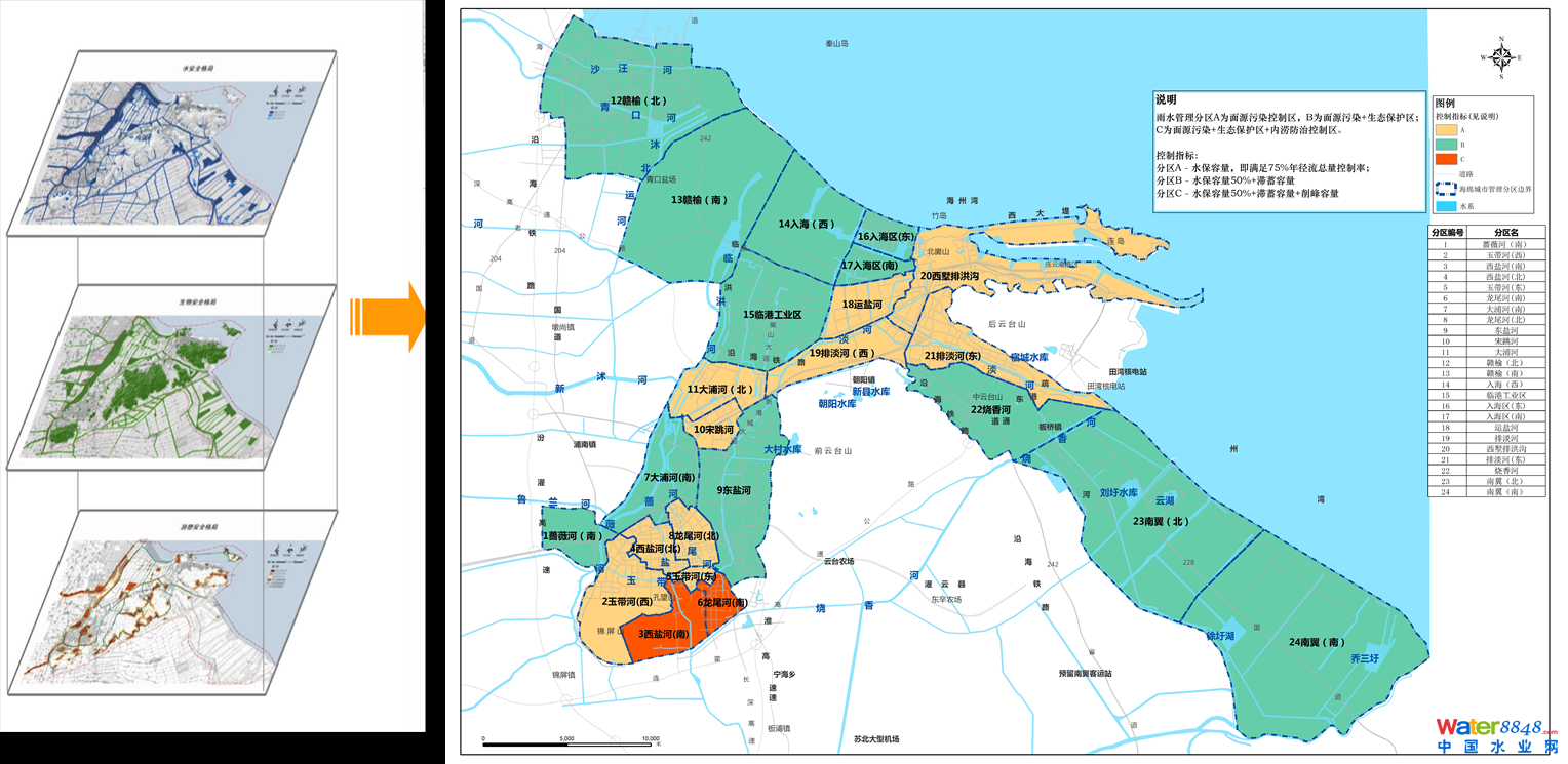 根據(jù)建城區(qū)排水分區(qū)和城市建設(shè)特征,劃分了24個(gè)海綿城市管理分區(qū)。考慮生態(tài)要素、內(nèi)澇問題和城市發(fā)展特征,確定每區(qū)的海綿城市建設(shè)控制指標(biāo)。