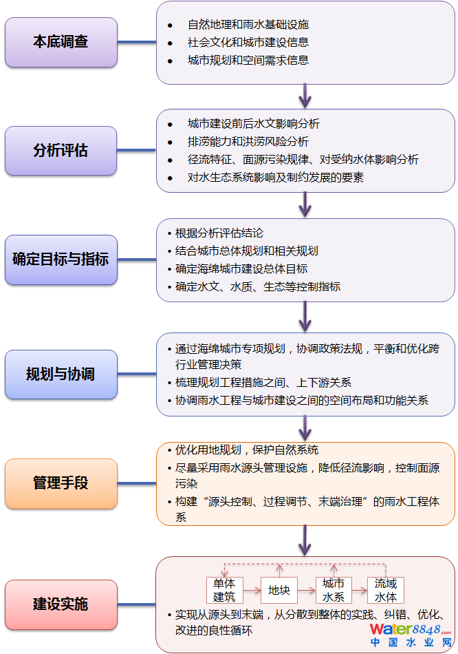 連云港海綿城市建設(shè)的技術(shù)路線首先需要調(diào)查城市的本底情況,掌握支撐城市建設(shè)管理的基礎(chǔ)信息;其次在本底調(diào)研、分析評(píng)估的基礎(chǔ)上,確定海綿城市建設(shè)的目標(biāo)與指標(biāo);再次通過(guò)規(guī)劃協(xié)調(diào)、建設(shè)實(shí)施,由點(diǎn)到面、系統(tǒng)推進(jìn)海綿城市的建設(shè)。