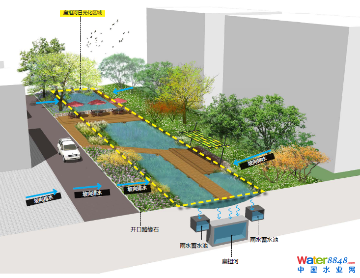 扁擔(dān)河原有的天然河道,連接龍尾河與西鹽河。在城市化進(jìn)程中,扁擔(dān)河被埋入地下,僅剩余約320m長(zhǎng)的河段被加蓋為暗渠。扁擔(dān)河原有的匯流區(qū)被管網(wǎng)化后,文昌路大慶路等區(qū)域的道路需繞道接入龍尾河,造成積水內(nèi)澇、雨污溢流污染問題突出。將320m長(zhǎng),均寬15m的扁擔(dān)河進(jìn)行生態(tài)改造,拆除通灌南路至龍尾河一段的3孔2m*2.5m暗涵,重新鋪設(shè)2孔2m*1m暗涵。上面做成下凹式綠化開放空間,拆除扁擔(dān)河暗涵兩側(cè)的臨時(shí)建筑,修建地下雨水箱2m*1.5m*100m,收集周邊地塊的雨水徑流,用于綠地灌溉和雜用水。