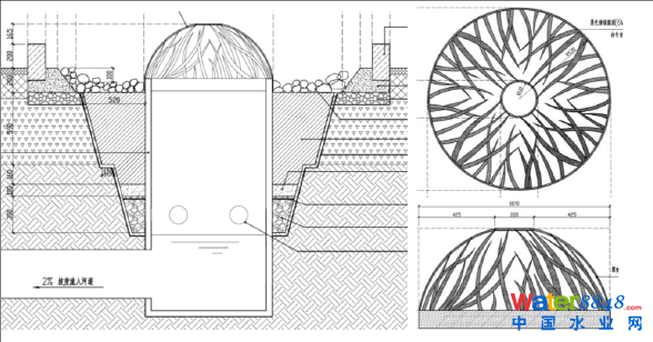生態(tài)滯留草溝末端設(shè)置溢流式雨水口,雨水口入口標高高于透水土壤表面底部15cm。溢流雨水口采用國標圓形檢查井,與過路雨水橫管相連。
