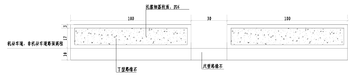 金山湖路設(shè)計了斷開式路牙作為路面徑流流入生態(tài)滯留草溝的通道,采用100cm丁型路緣石(高于路面20cm)和30cm戊型路緣石(與路面齊平)間斷布置的形式,設(shè)置于生態(tài)滯留草溝的兩側(cè),道路全線布置。