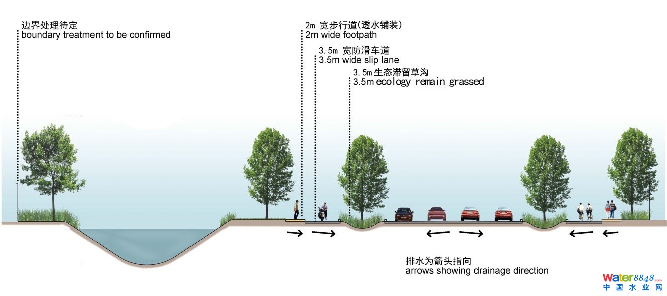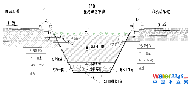 利用道路側(cè)向分隔帶設(shè)置3.5m寬生態(tài)滯留草溝,并設(shè)置人行道透水鋪裝,道路橫坡坡向側(cè)分帶內(nèi)的生態(tài)滯留草溝,考慮開口路牙或者平路牙的入流形式。