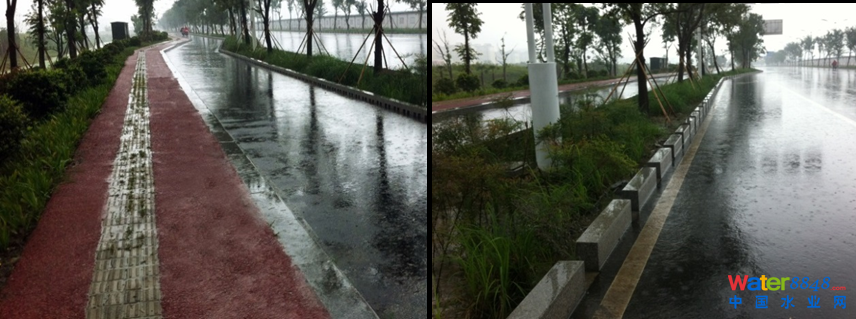 金山湖路的人行道采用了彩色透水混凝土鋪裝的設(shè)計。