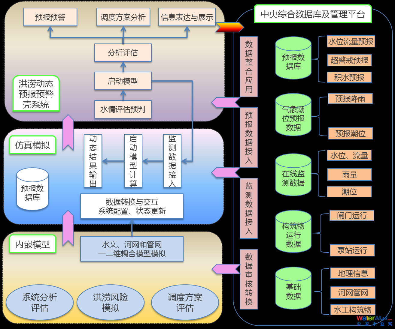 系統(tǒng)設計從頂層設計出發(fā),利用荷蘭三角洲研究院FEWS軟件,開發(fā)洪澇動態(tài)預警平臺,集成模型(含一維水文模型、河網(wǎng)水動力模型、管網(wǎng)模型,二維地表漫流模型)和水文氣象監(jiān)測信息,自主研發(fā)出一套全新的洪澇動態(tài)預警預報系統(tǒng)。
