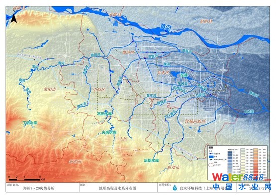 7·20暴雨中心由西南山區(qū)逐漸向東北鄭州市區(qū)發(fā)展,導致城市河道由于山區(qū)暴雨徑流和水庫安全下泄,水位快速抬升,在市區(qū)發(fā)生特大暴雨時,城區(qū)河道排水條件不利。