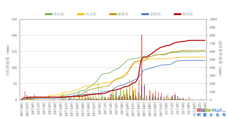 圖 4 鄭州市及西部國家雨量站7.20暴雨逐時和累積降雨量(制圖:宜水環(huán)境)