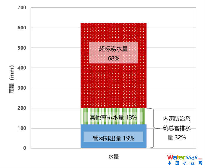 根據(jù)上述特征暴雨雨量分析,管網(wǎng)在設計能力條件下排水量(含海綿設施)占本次極端降雨總雨量的19%,50年一遇防澇系統(tǒng)排水量(含管網(wǎng))約占32%,超標雨水占比達到68%,大量超出內(nèi)澇防治體系能力標準的雨水將形成快速的地表坡面匯流,流向地勢低洼區(qū)域。