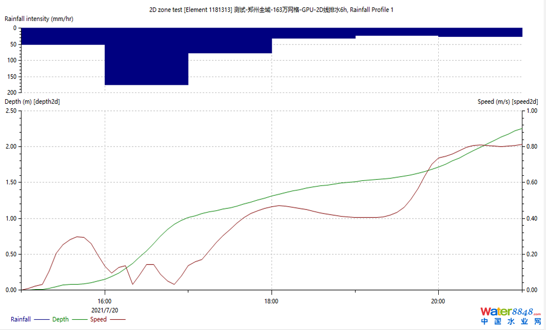 暴雨期間,鄭州市阜外華中心血管病醫(yī)院(簡稱阜外醫(yī)院)因暴雨積水,停水斷電、道路受淹、交通受阻,導致近5000人被困。阜外醫(yī)院所在的城東中牟處于鄭州地勢最低處,賈魯河、魏河、龍湖等水體交匯處下游,暴雨后河水暴漲導致大量積水倒灌,導致路面水位上升速度快、漲幅高,但受地形影響退水速度較慢。通過模擬2021年7月20日15時~7月20日21時間鄭州站實際降雨,結(jié)果顯示阜外醫(yī)院周邊區(qū)域水位6小時水位上升可達到2.25m左右。