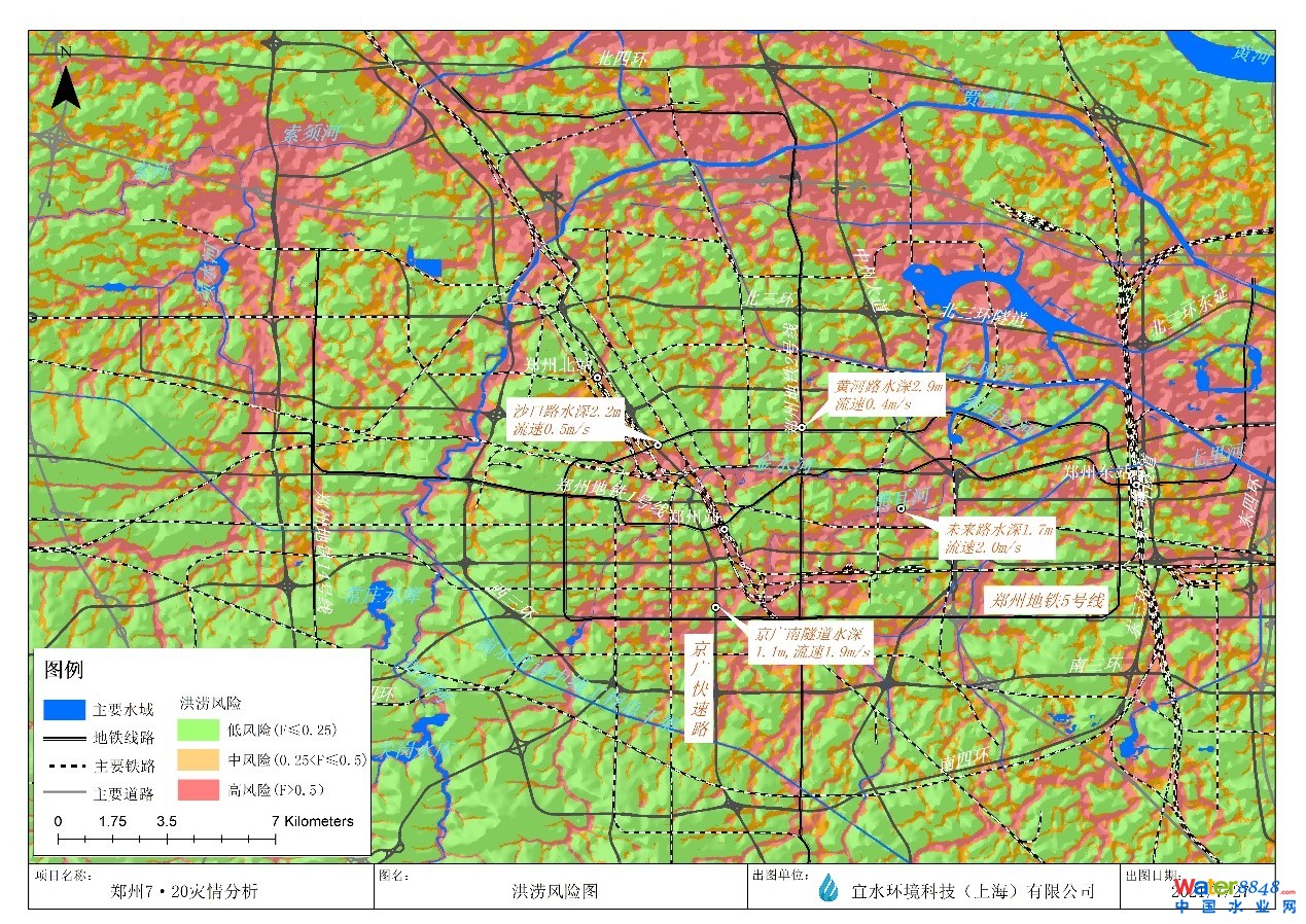此外,賈魯河、金水河、十八里河和七里河等河道中上游兩岸也存在中、高淹沒風險區(qū),此次鄭州暴雨導致城區(qū)內(nèi)河道遠超其排水能力。大部分區(qū)域淹沒水深大于0.5米,甚至1-2米,流速大于0.8米/秒,水流風險極大,嚴重影響城市安全。