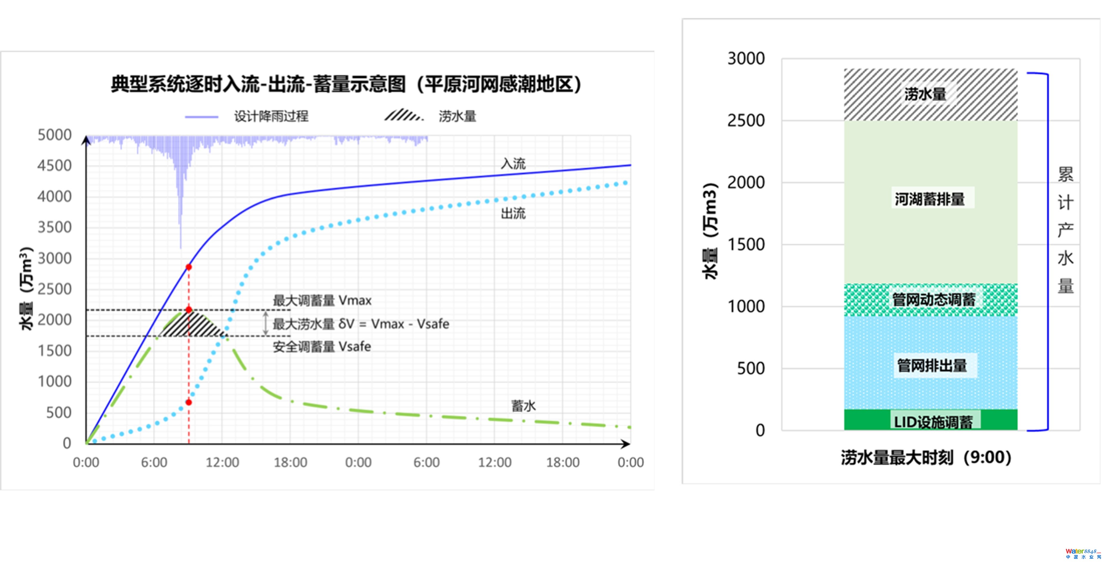 任一排水系統(tǒng)(或子系統(tǒng)),降雨徑流進入系統(tǒng)后,是排水能力與系統(tǒng)調(diào)蓄量之間的平衡。當排水能力受限,系統(tǒng)調(diào)蓄量超過防洪排澇設計標準安全蓄量時,發(fā)生內(nèi)澇(見圖11)。