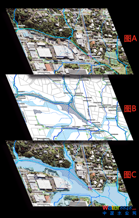 - 超標系統(tǒng)(圖C)-(如大于50年一遇)的降雨事件,主要設施包括:調(diào)蓄設施、城市河湖、超標泄流通道、地表淹沒區(qū)域,預案以及應急響應非工程減災手段。