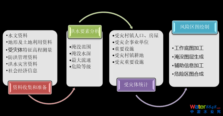 此文結(jié)合本公司在多個(gè)國內(nèi)外洪澇風(fēng)險(xiǎn)評估項(xiàng)目中的實(shí)戰(zhàn)經(jīng)驗(yàn),凝練出洪水風(fēng)險(xiǎn)區(qū)圖編制的通用流程,即四個(gè)步驟:基礎(chǔ)資料收集、洪水要素分析、受災(zāi)體統(tǒng)計(jì)以及風(fēng)險(xiǎn)圖繪制。