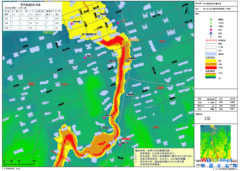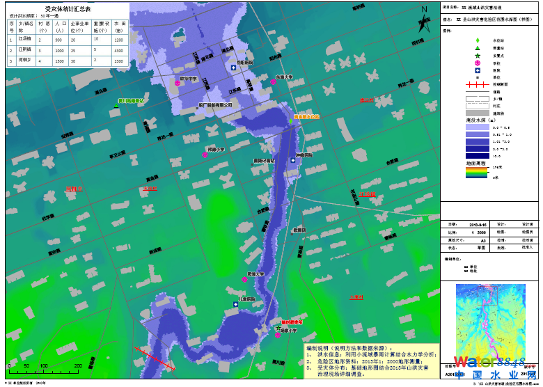 洪水要素圖(范圍水深圖)的樣圖在地理底圖層上,通過不同的顏色表示不同檔次的淹沒水深、并用用醒目的點(diǎn)表示可能的受災(zāi)體,并在圖幅內(nèi)列出受災(zāi)體匯總統(tǒng)計(jì)總表(如表2)、編制說明、圖名、圖例、比例尺、指北針及制圖質(zhì)量控制信息。
