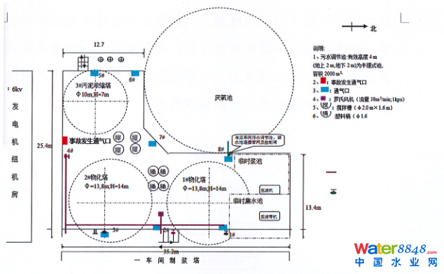 一車間和三車間各設(shè)有一套污水處理系統(tǒng)。事故發(fā)生在一車間污水調(diào)節(jié)池(又稱事故應(yīng)急池)。該污水調(diào)節(jié)池為半地下池,有效高度4米(地上2米,地下2米),容積約2000立方米;池面平臺(tái)設(shè)置有8個(gè)通氣口(規(guī)格約1.5米×0.8米),平時(shí)以活動(dòng)格柵覆蓋(未上鎖);在東南角池面平臺(tái)下約2米處設(shè)置有一個(gè)人孔(直徑為0.6米)。