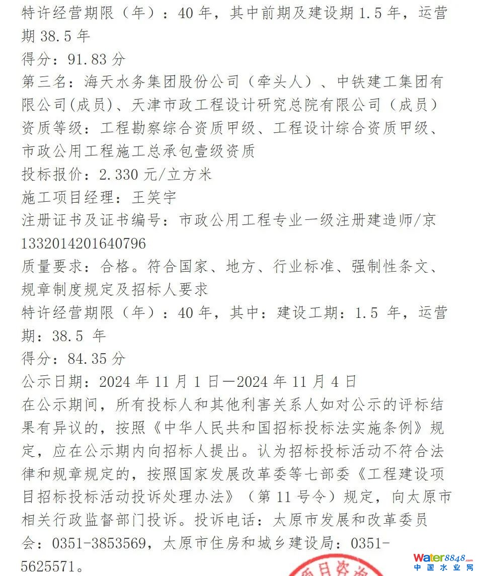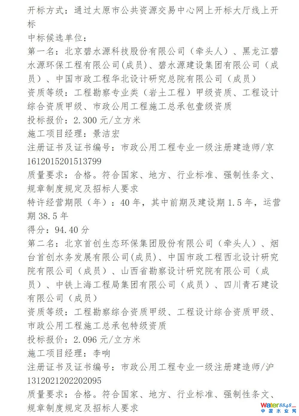 11月1日,山西太原市龍城污水處理廠工程特許經(jīng)營項目中標(biāo)候選人公示,第一中標(biāo)候選人:北京碧水源科技股份有限公司(牽頭人)、黑龍江碧水源環(huán)保工程有限公司(成員)、碧水源建設(shè)集團(tuán)有限公司(成員)、中國市政工程華北設(shè)計研究總院有限公司(成員),投標(biāo)報價2.3元/立方米。
