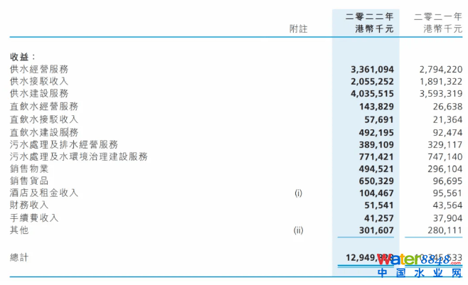 建設(shè)BOT水務(wù)項目。2022年,在建水廠主要位于廣東、山東、廣西、湖南、山西及遼寧各省。其就其水處理業(yè)務(wù)以BOT方式訂立多項服務(wù)特許權(quán)合約。根據(jù)香港(國際財務(wù)報告詮釋委員會)-詮釋第12號服務(wù)特許權(quán)安排,其參照建造期內(nèi)所提供之建造服務(wù)之公允值確認(rèn)建造收入。該等服務(wù)之公允值乃參考服務(wù)特許權(quán)協(xié)議訂定當(dāng)日之當(dāng)前市場毛利率,以成本加成法估計。建造收入以完成百分比方式確認(rèn)入賬。建造BOT水務(wù)項目之總營業(yè)收入為4626100000港元(2021年12月31日:9533200000港元)。